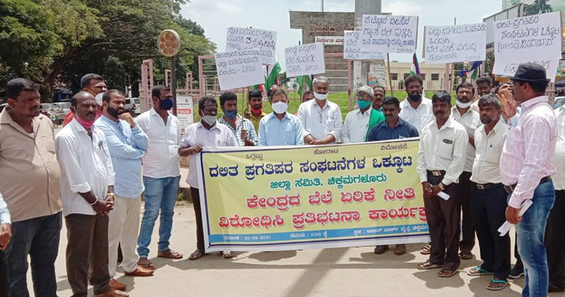 ಚಿಕ್ಕಮಗಳೂರು : ದೇಶದಲ್ಲಿ ಬೆಲೆ ಏರಿಕೆ ಹಾಗೂ ಜನವಿರೋಧಿ ಕೃಷಿ ಕಾಯ್ದೆಗಳ ವಿರೋಧಿಸಿ ದಲಿತ ಪ್ರಗತಿಪರ ಸಂಘಟನೆಗಳ ಒಕ್ಕೂಟದ ಕಾರ್ಯಕರ್ತರು ಸೋಮವಾರ ನಗರದ ಆಜಾದ್ ಪಾರ್ಕ್ ವೃತ್ತದ ಎದುರು ದಿಢೀರ್ ಪ್ರತಿಭಟನೆ ಕೈಗೊಂಡರು.
