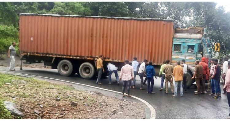 ಹತ್ತು ಚಕ್ರದ ಲಾರಿ ಚಾರ್ಮುಡಿಯಲ್ಲಿ ಸಿಕ್ಕಿಕೊಂಡು ಸಂಚಾರ ಅವ್ಯವಸ್ಥೆ