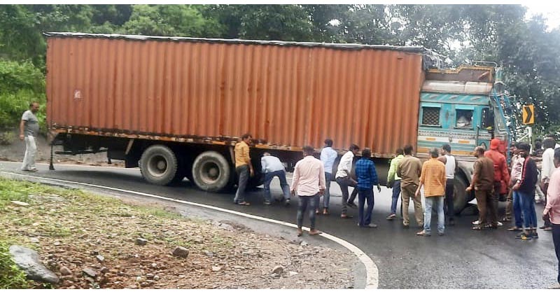 ಹತ್ತು ಚಕ್ರದ ಲಾರಿ ಚಾರ್ಮುಡಿಯಲ್ಲಿ ಸಿಕ್ಕಿಕೊಂಡು ಸಂಚಾರ ಅವ್ಯವಸ್ಥೆ